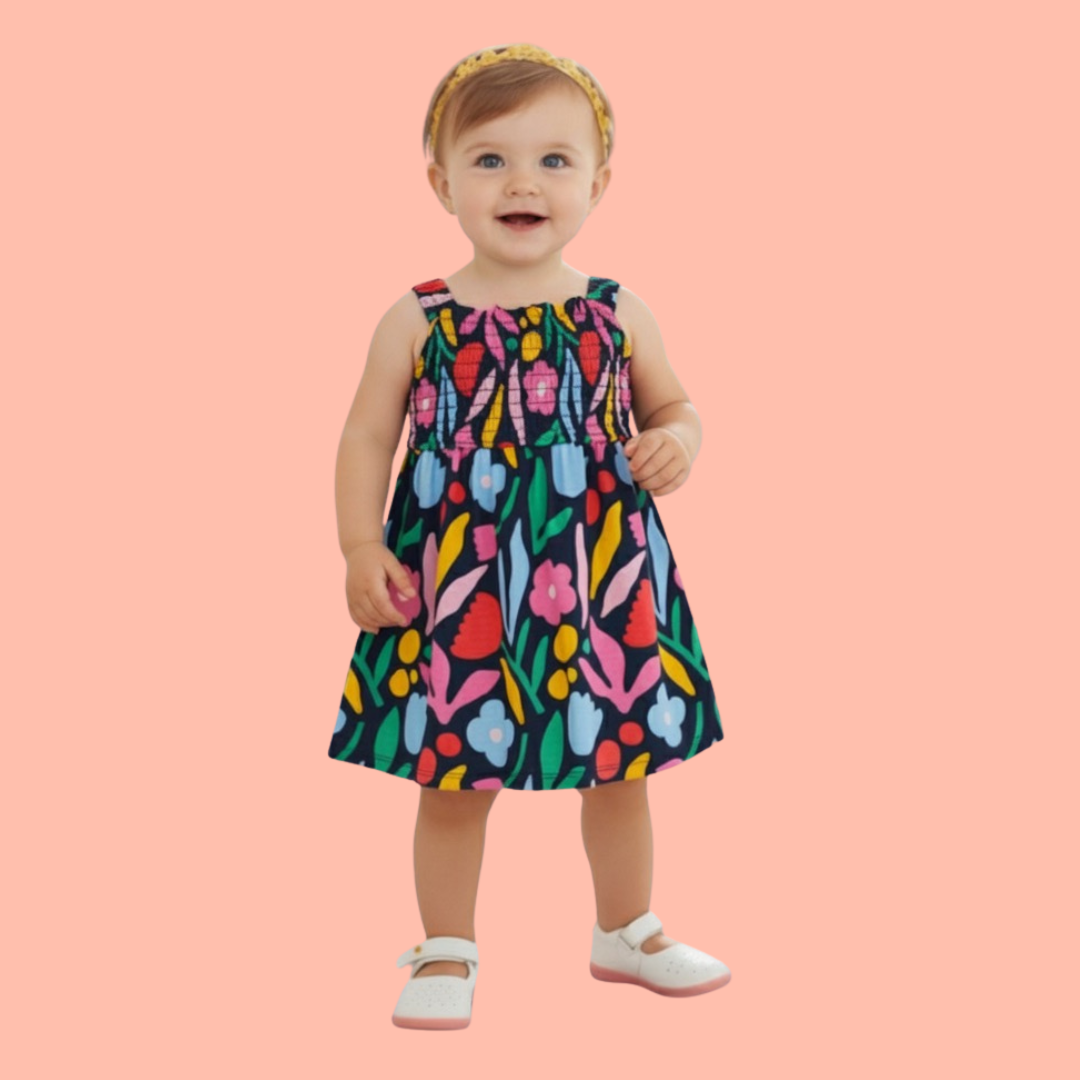 Sleeves less Floral Print - Multicolor Frock with Grip Style, Baby Girls Frock, Daily Wear Frock